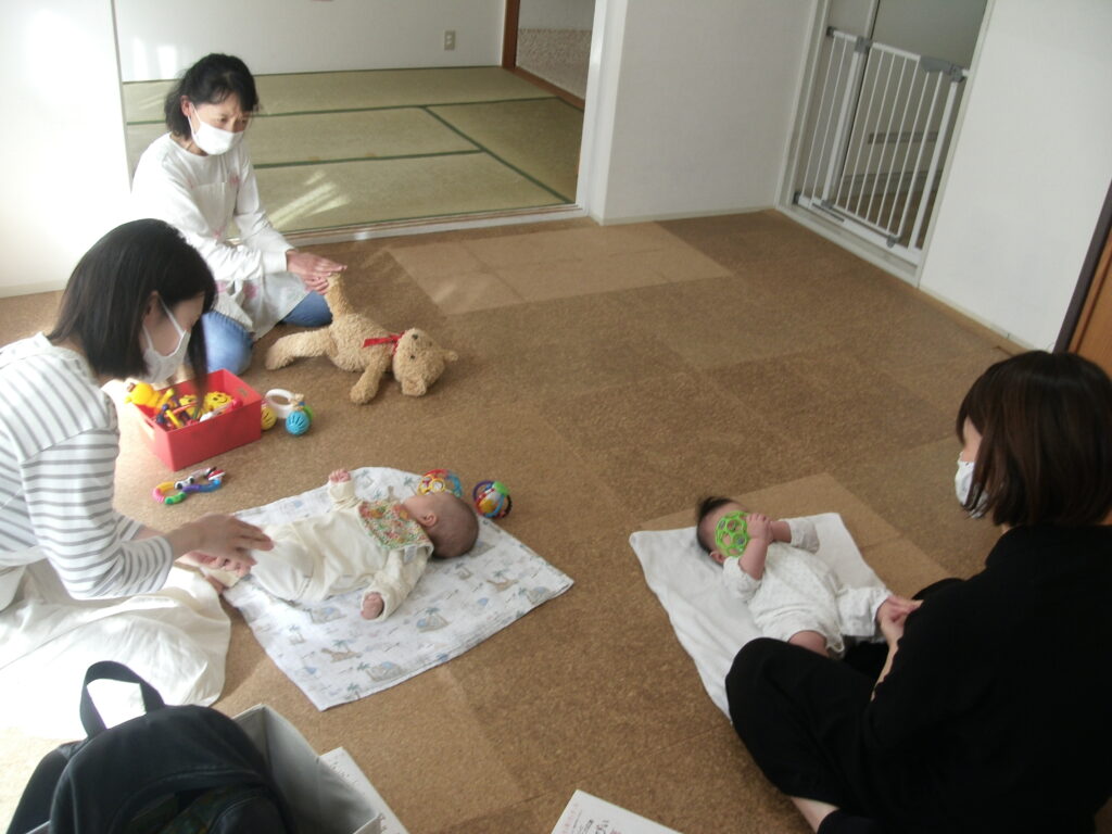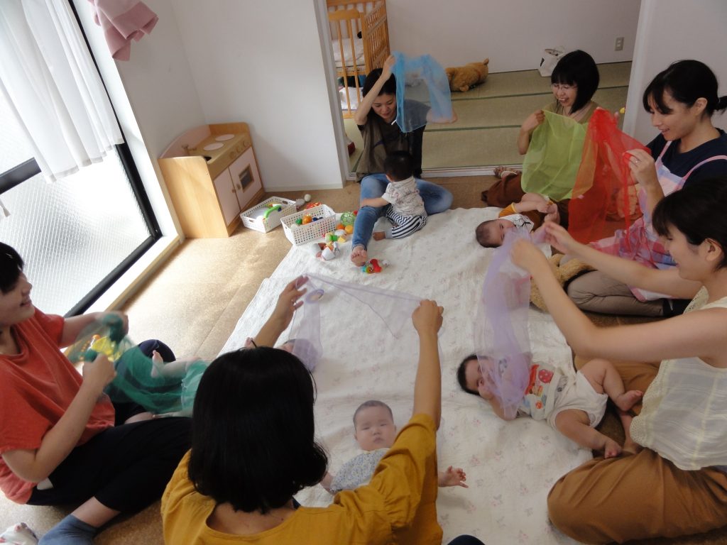 8月30日(金)は「集まれBABY!」の日でした。 ご近所の0歳児ちゃんたちが広場に遊びに来てくれました。 音のするほうに反応する子、 寝返りをうつ子、それを見る子、 シフォン布の動きに、声をあげてはしゃぐ子... -