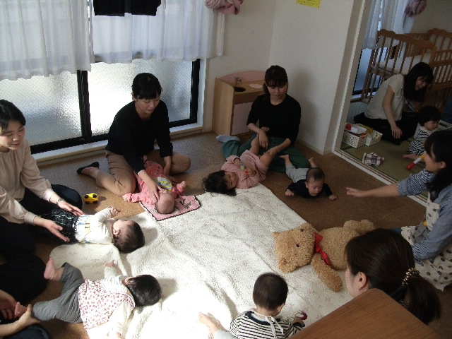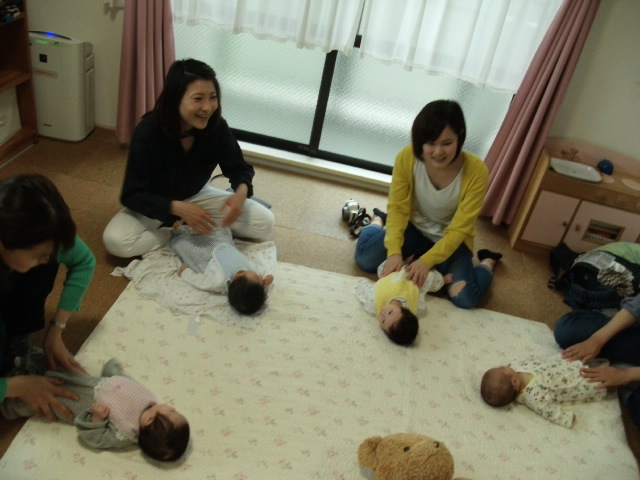 4月のベビーの日のご報告です♪ はじめましての方たち同士、みんなでおしゃべりしました♪ さっそく意気投合していた皆さま、、そんなときはふれあい遊びの時間も少しずれることもあります 端午の節句の前だったので、こいのぼりの寝相アートで写真...