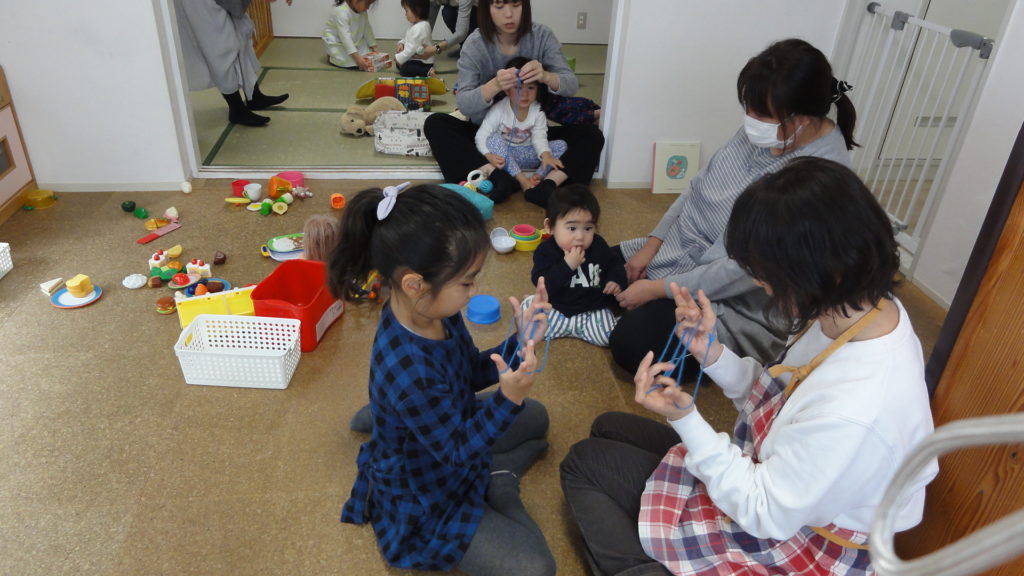 年上のお姉ちゃんがあやとりを教えてくれたので、 年下のみんなもチャレンジしたくなったようで♪ なになにー♪ 楽しそうだね! -