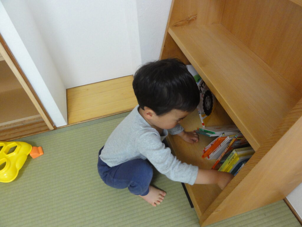 お昼前と帰りの時間には絵本を読む時間をもうけています。 今日は何を読んでもらおうかな~ 真剣なまなざしで絵本をセレクト中 -