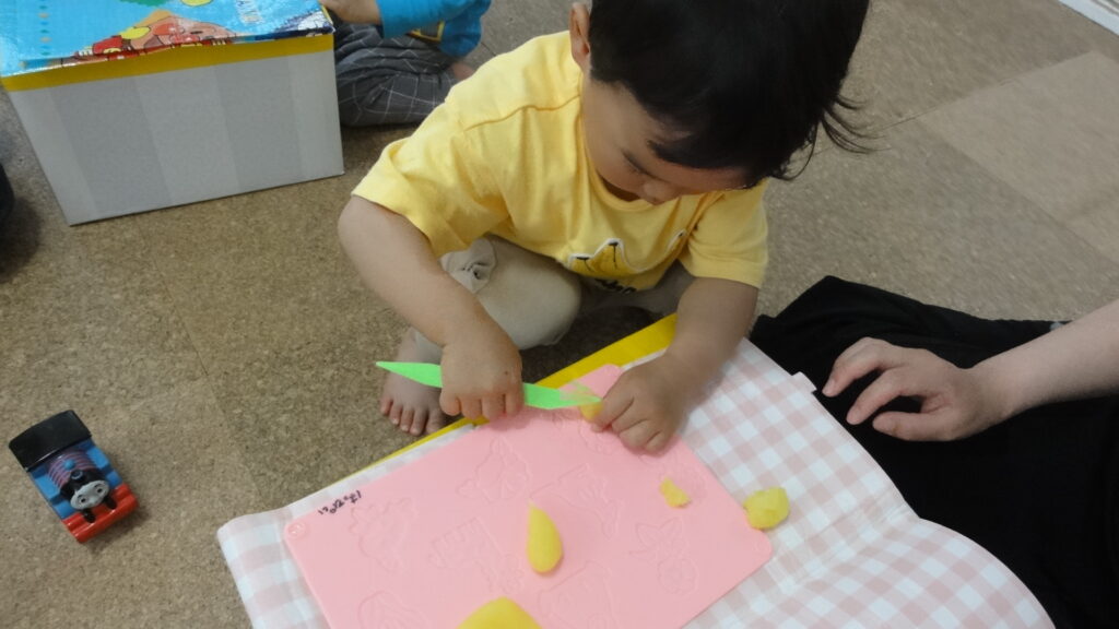こどもシェフたち! どんな料理ができるのか楽しみです! 小麦粉ねんどでこねこね、切ったりちぎったり。大忙しです。 なにしてるの? と、聞くと、 「じゃがいものめをとってるの!」 おかあさんのお料理している様子をよく見ているんだね -