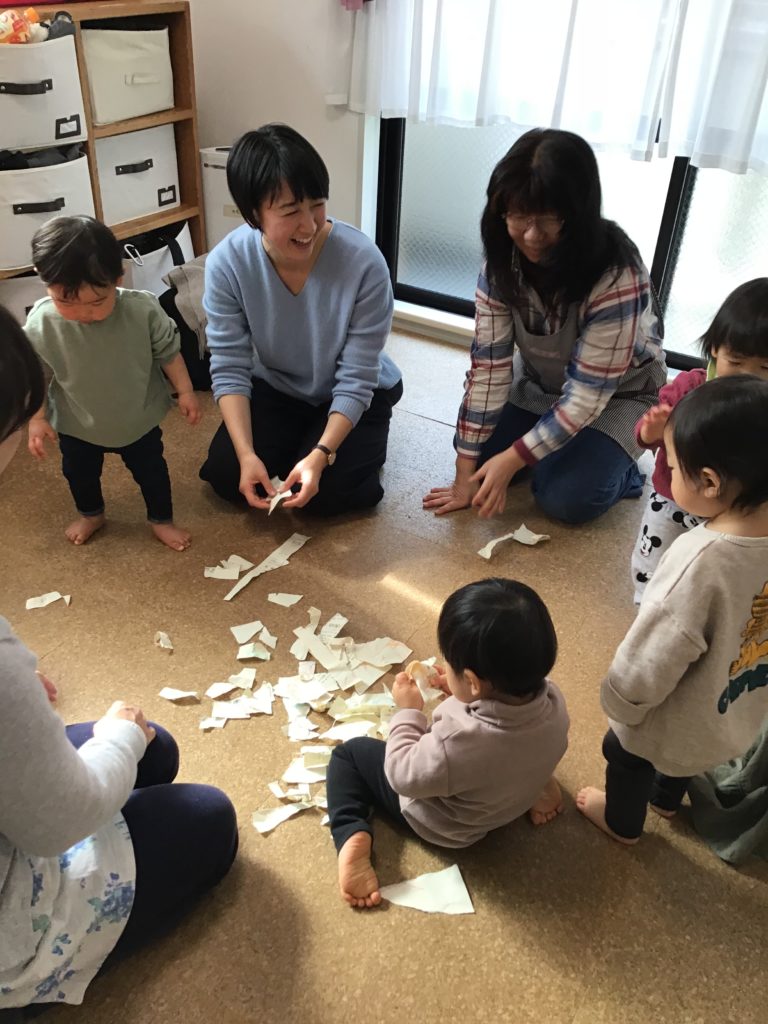 今日もまた寒い中でしたが、みんなでワイワイにぎやか広場。人が多いとお部屋もあたたまります。笑 ランチごっこ お手々をぱっちん♪ 紙をびりびりー 一人二人と増えていき、最初は様子を見ていた子も途中参戦♪ お預かりの子も一緒に遊んでます(^-^)... -