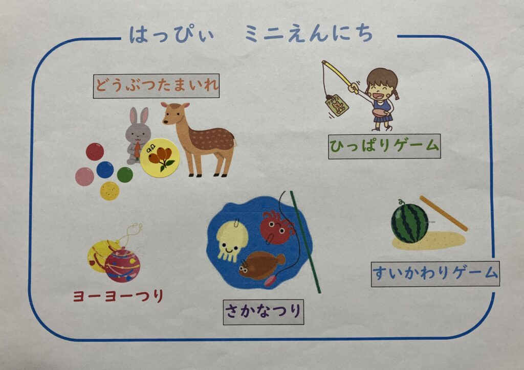 8月24日のはっぴぃミニえんにちには多くの親子が遊びにきてくれました。 さかなつりやどうぶつたまいれ、スイカわりゲームなど室内でおまつり気分! えんにちで遊んだらシール貼り、全部クリアしてとてもうれしそうにしているお子さんも。 どうぶつたまい... -