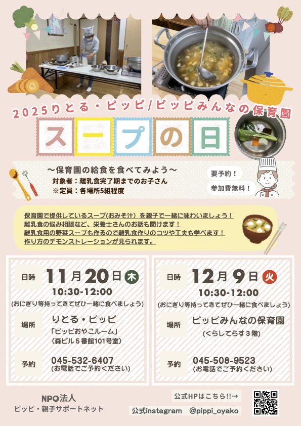 2025年10月28日 / 最終更新日 : 2025年10月28日 ppminnanohoikuen イベント 「スープの日」@ピッピひろば 開催します! 12月9日(火)は、「スープの日」を開催します。 保育園の給食で提供しているお味噌汁を作るところを実演します。 保育園の栄養士さんのお話を聞きながらみんなで楽しく試食タイム! おにぎりなどの主食も持参いただくと楽しいひと時になるのでは? 普段聞けない離乳食やおやつのことなど、栄養や食に関する質問もできます。 ぜひ、ご参加ください! ご予約はお電話でお願いします。 045−508−9523 *この日は3階のA会議室と調理室を使って開催します FacebookXCopy