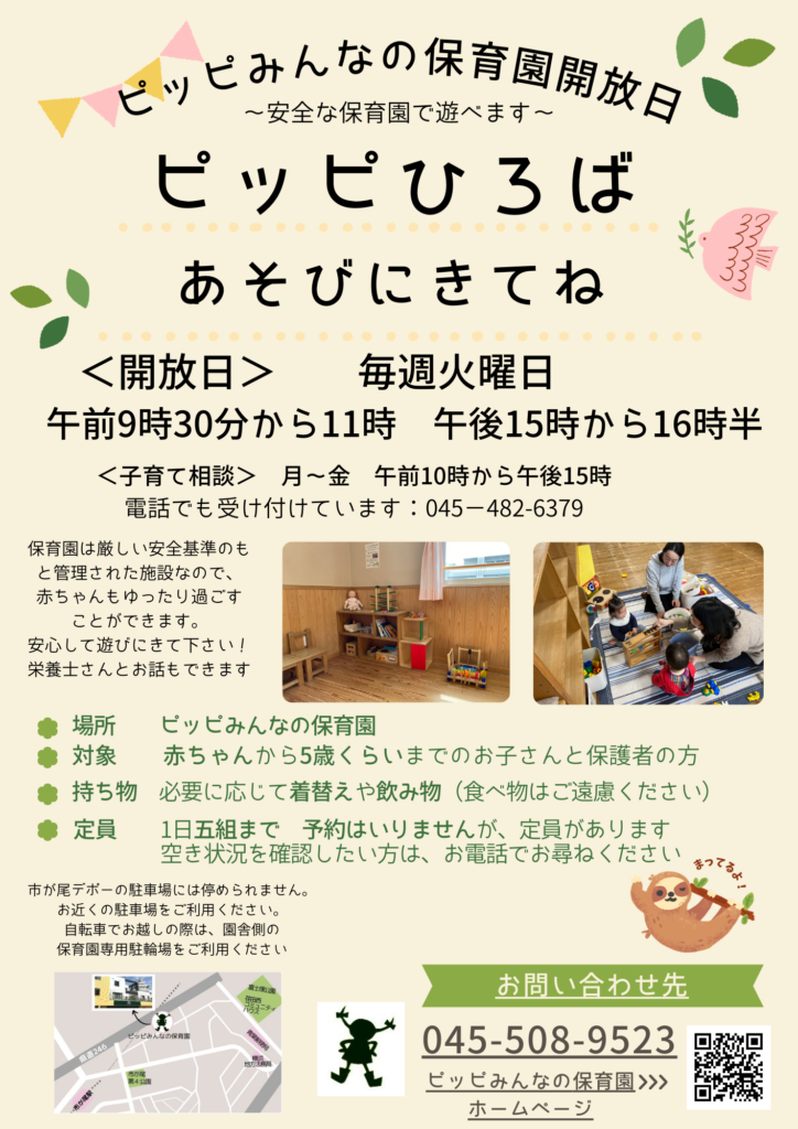 ピッピみんなの保育園では、毎週火曜日に広場を開催しています。 保育園って、どんなところかな? おともだちをさがしたいな。 離乳食・・・大丈夫かしら? 保育士さんや栄養士さんに気軽に相談もできます。 開催時間の中なら、何時に遊びにきても帰って... -